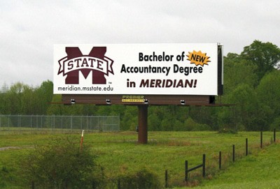 If you’ve recently driven along Interstate 20 in east Mississippi, your attention may have been grabbed by a couple of rather noticeable promotions. The MSU Meridian Division of Business is taking advantage of the well-trafficked artery with billboards promoting its programs – particularly its new accounting degree.
